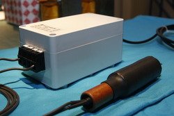 Der Transformator ist in ein Kuststoffgehäuse eingebaut, doppelt isoliert und entspricht der Isolationsklasse II. Der Primäranschluß erfolgt durch ein 1,5m langes Kabel mit Konturstecker. Die Sekundärseite ist auf Klemmen geführt. An diese wird der Brandgriffel, der mit einem 1m langen Kabel versehen ist mittels Werkzeug angeschlossen.