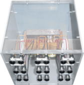 Alle Transformatoren werden von uns auch in ein kunststoffbeschichtetes Stahlblechgehäuse eingebaut. Anschlüsse im Gehäuseinneren über Anbauverschraubungen. Alle Standardgehäuse inkl. Eingangssicherung. Schutzart IP22.